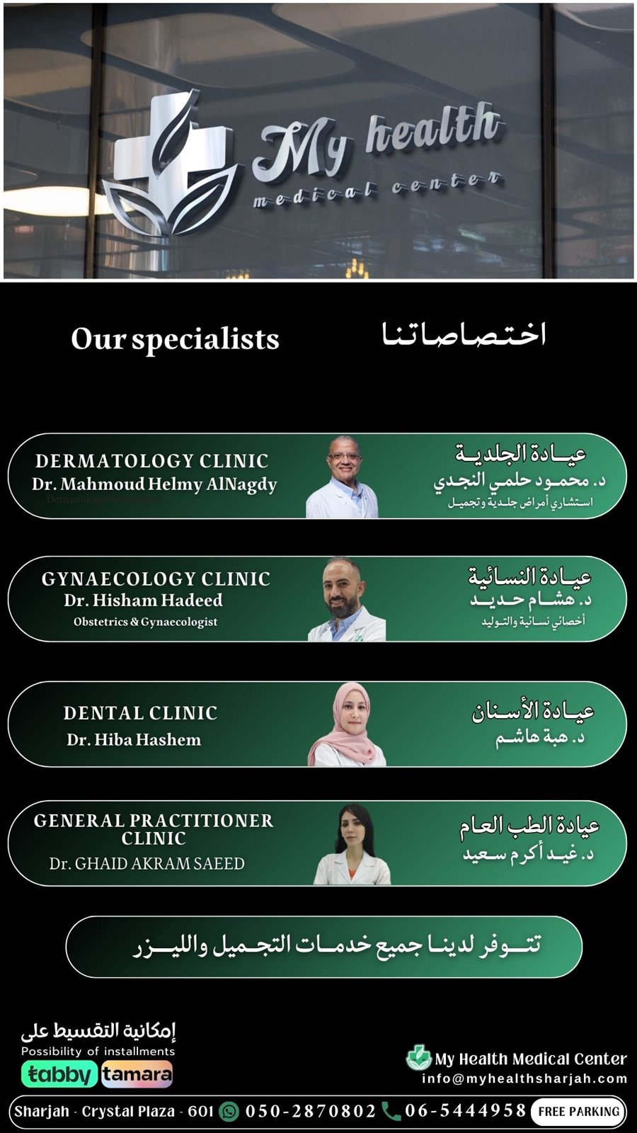 مركز طبي متكامل يقدم خدمات رعاية صحية عالية الجودة، تشمل عيادات الأمراض الجلدية، وأمراض النساء والتوليد، وطب الأسنان، بالإضافة إلى علاجات الليزر المتقدمة والفحوصات المخبرية. يلتزم المركز بتقديم رعاية آمنة ومهنية باستخدام أحدث التقنيات وعلى يد كوادر طبية مؤهلة