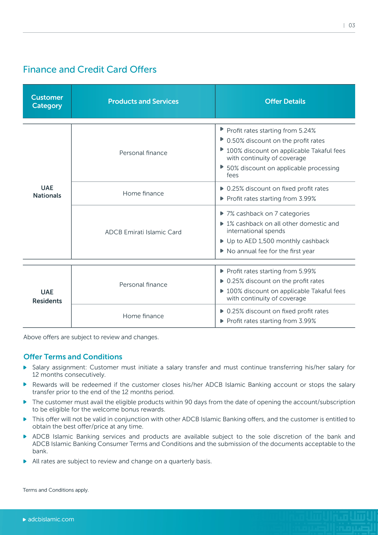 ADCB is a full-service commercial bank offering a wide range of products and services such as retail banking, wealth management, private banking, corporate banking, commercial banking, cash management, investment banking, corporate finance, foreign exchange, interest rate and currency derivatives, Islamic products, project finance, and property management service